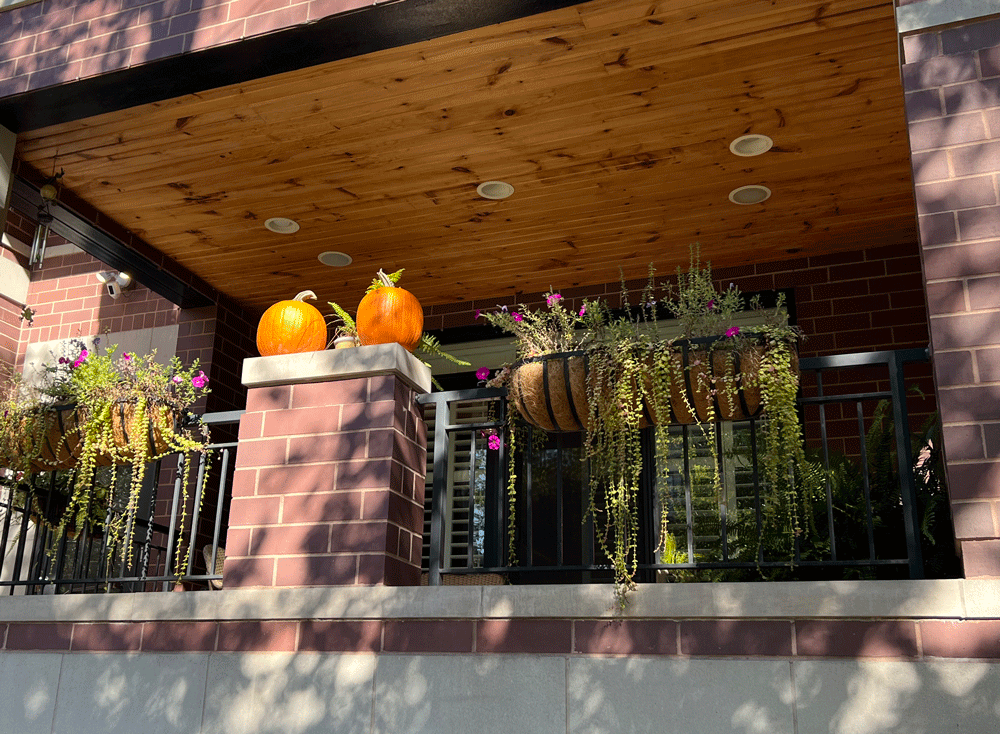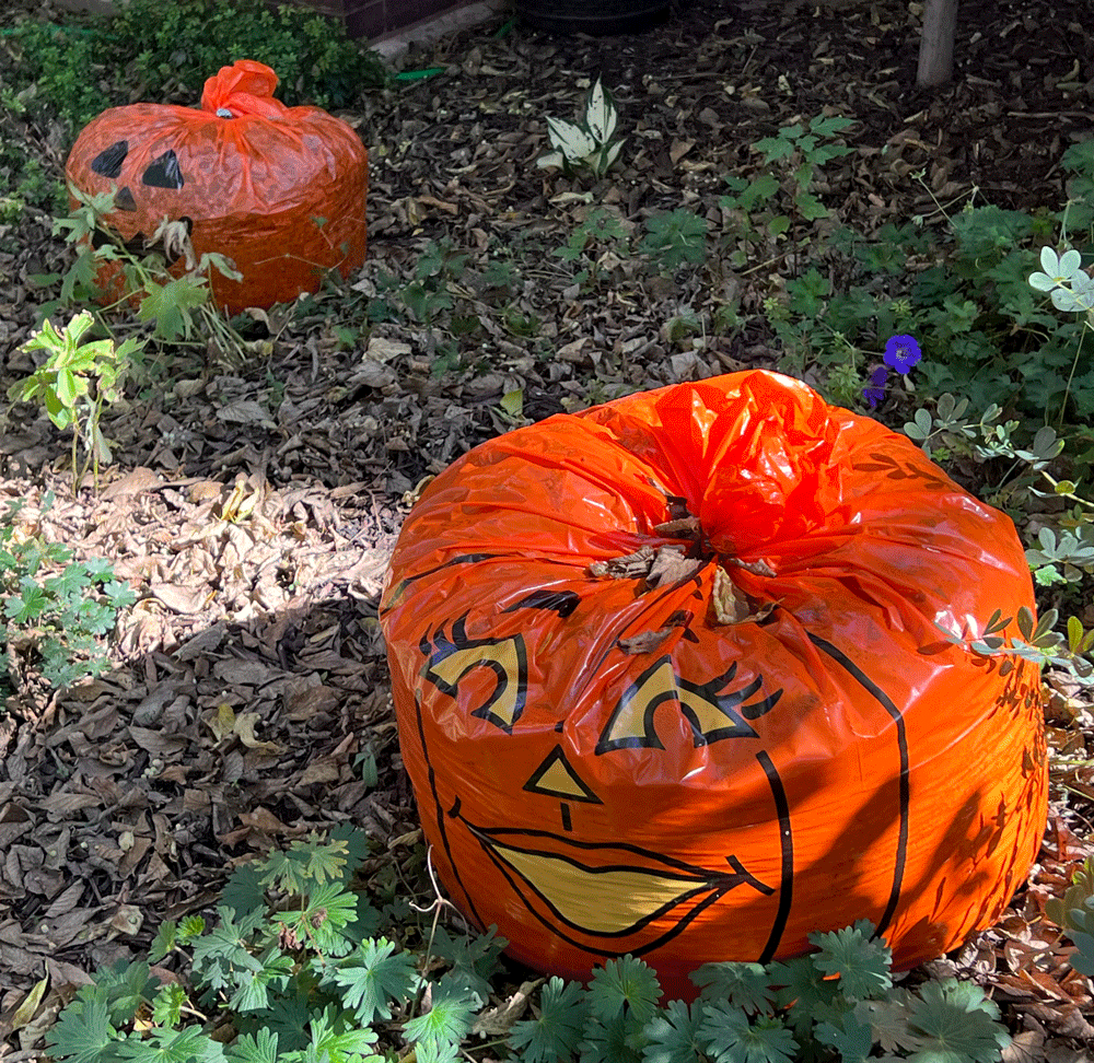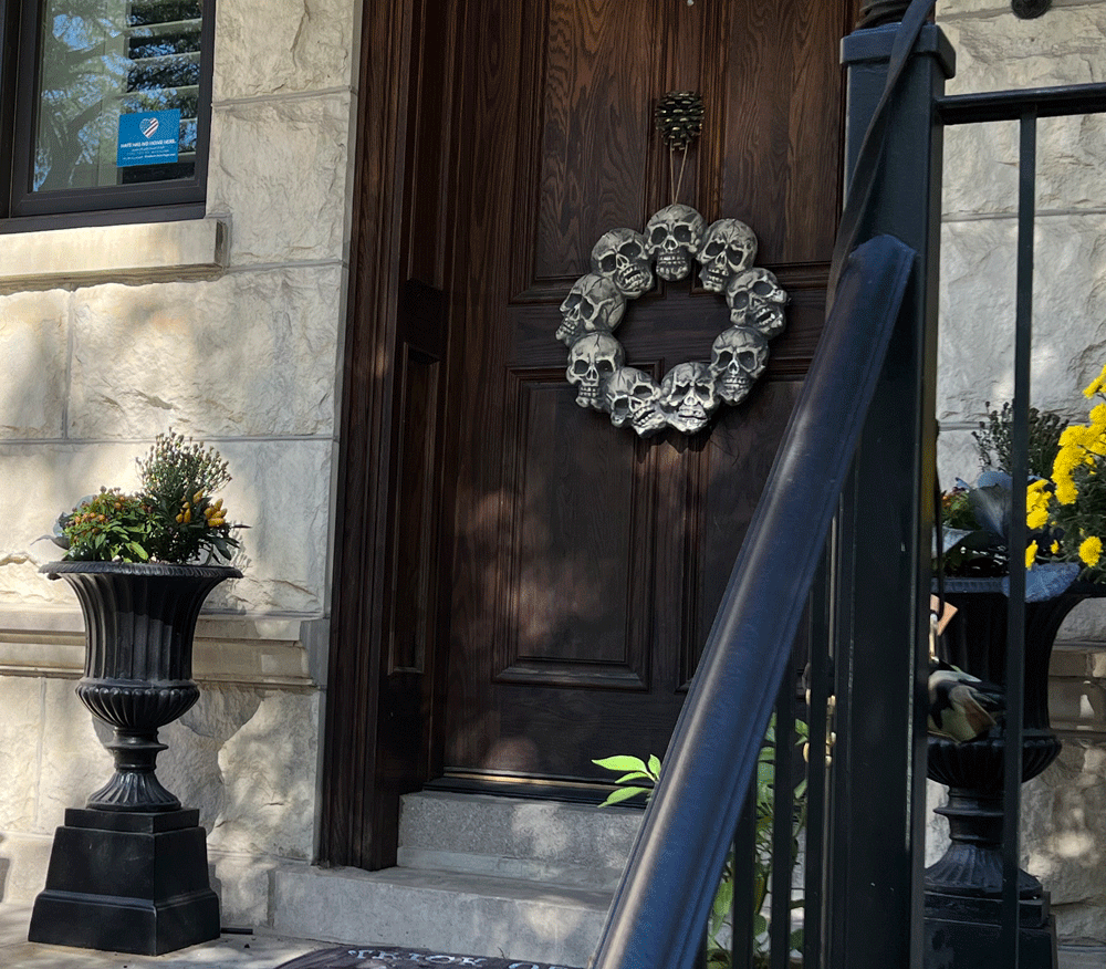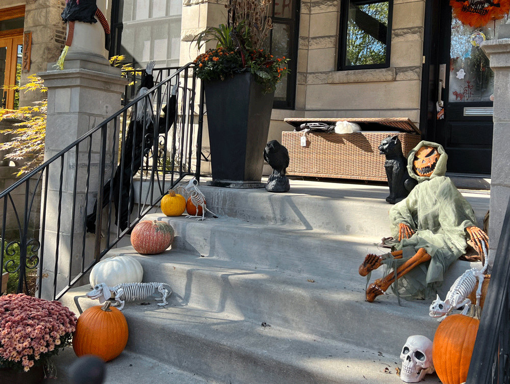 On my recent visit to Chicago, I was eager to walk the neighborhood where I was staying. Like Kirkland, the Lakeview neighborhood has level sidewalks and clearly marked streets, with a mixture of housing styles, old and new, single family and apartments, as well as businesses and schools. There’s also a cemetery, which can also be found in Kirkland, but not on my usual walk. Since my visit was in October, I was curious how the decorations might compare to those at home.
