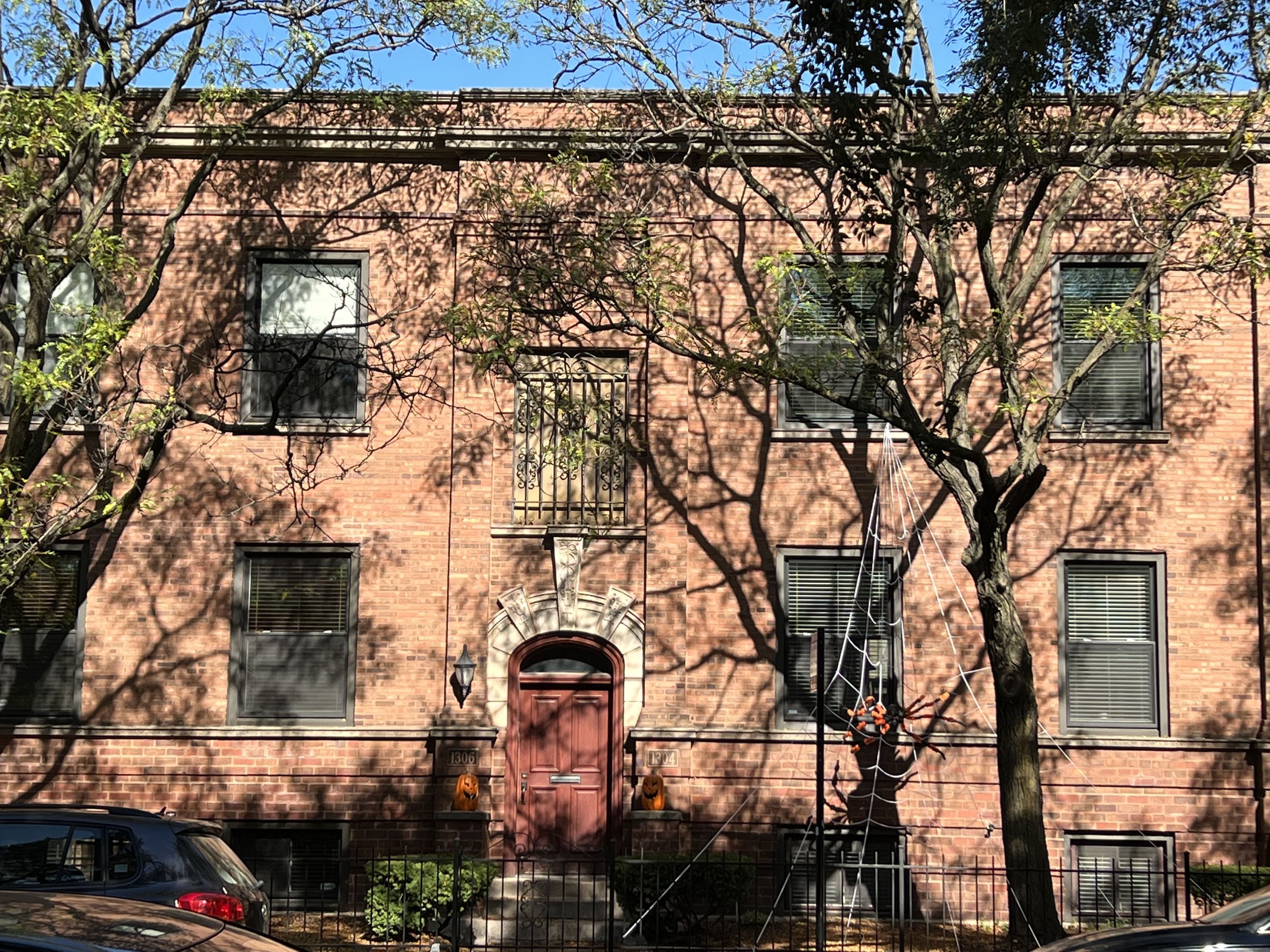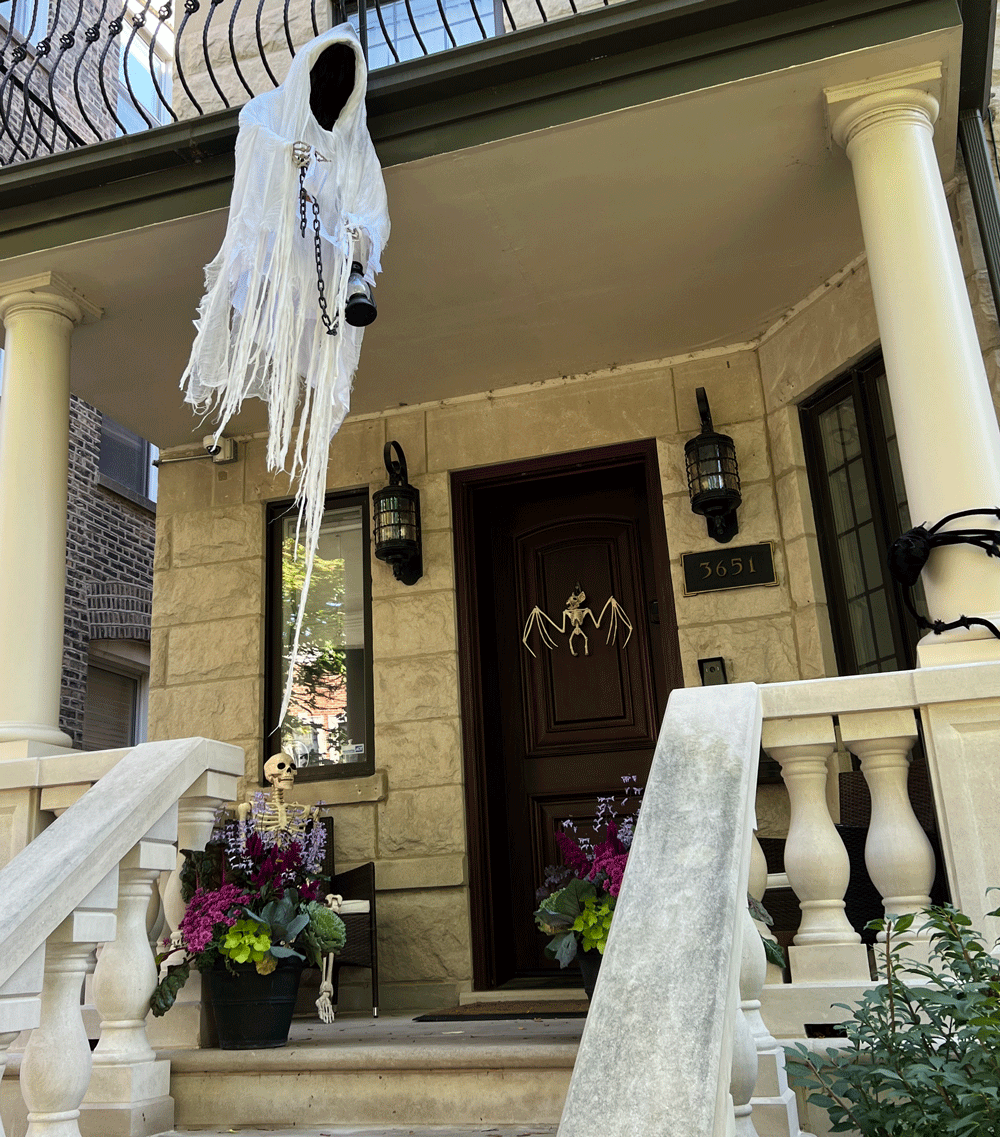 Many people associate Halloween with cemeteries, tombstones and ghosts. Chicago’s Lakeview neighborhood is home to several real cemeteries. Graceland Cemetery is a well-known historic cemetery that I toured during an earlier visit to Chicago. It is well worth a visit, but on this walk I just took a quick peek through the fence at the nearby Hebrew Benevolent Cemetery, which was founded in 1851. I didn’t see fall color or decorations, so I walked on by, preferring the fake tombstones and ghosts in neighboring frontyards.