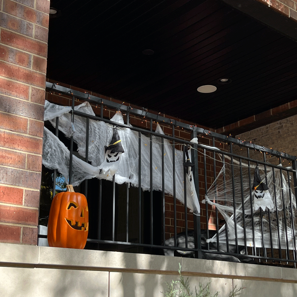 Since it’s fall, pumpkins and their gourd relations are the most common decoration. Homes in the Lakeview neighborhood commonly include front steps that provide a popular spot to display Jack O-Lanterns and other fall décor. Some displays appeared to be so perfectly styled that I suspected they’d been provided by a professional. In other cases, there were hand-carved pumpkins with imperfections that made me envision a family project with kids overly eager to light them, contributing to a premature droopy appearance. Where did all the variety of pumpkins and gourds come from? Suddenly they show up in a wide array of colors and shapes. Do some people make pumpkins pie out of the blue, green and white pumpkins? Curious minds would like to know. Some windows displayed hand-made paper decorations that made me smile, since they were a reminder that this was likely a family home with kids eagerly awaiting the arrival of Halloween.